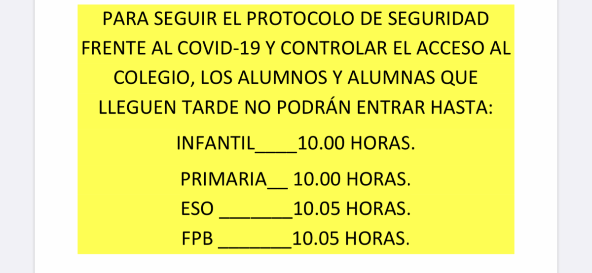 PARA SEGUIR EL PROTOCOLO DE SEGURIDAD FRENTE AL COVID-19 Y CONTROLAR EL ACCESO AL COLEGIO, LOS ALUMNOS Y ALUMNAS QUE LLEGUEN TARDE NO PODRÁN ENTRAR HASTA: INFANTIL___10,00 HORAS (por su puerta de entrada) PRIMARIA__ 10,00 HORAS ESO _______10,05 HORAS FPB _______10,05 HORAS