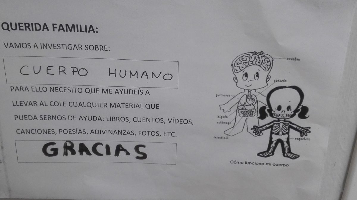 Los niñ@s de 4 años, hemos comenzado un nuevo proyecto sobre el cuerpo humano. Estamos aprendiendo muchas cosas sobre nuestro cuerpo. Cómo es por fuera, cómo es por dentro, cómo tenemos que cuidarlo para mantenerlo sano, etc. Escribimos una carta a las familias para pedir su colaboración. Hemos hecho dibujos, canciones, adivinanzas, cuentos y libros. [...]
