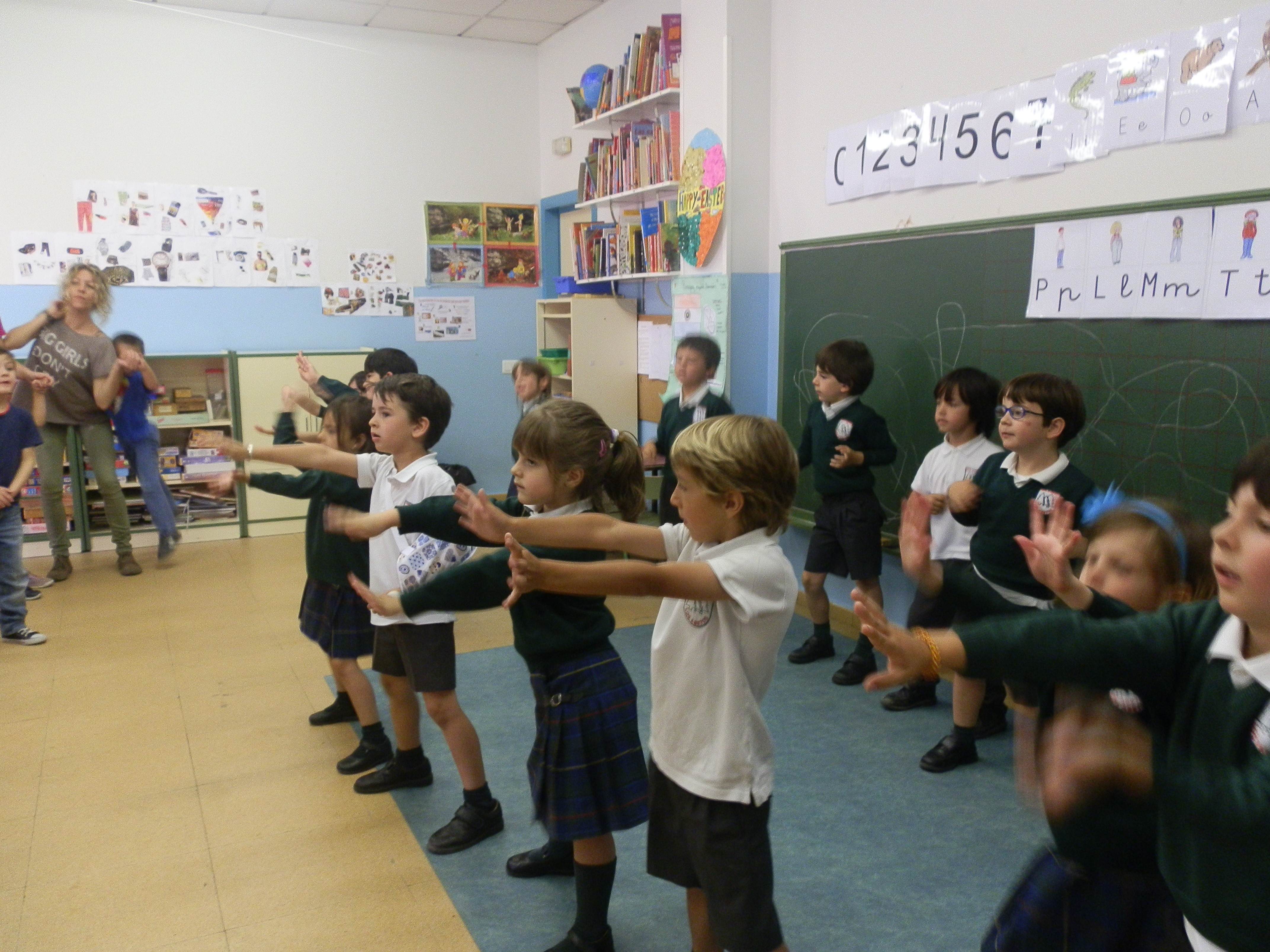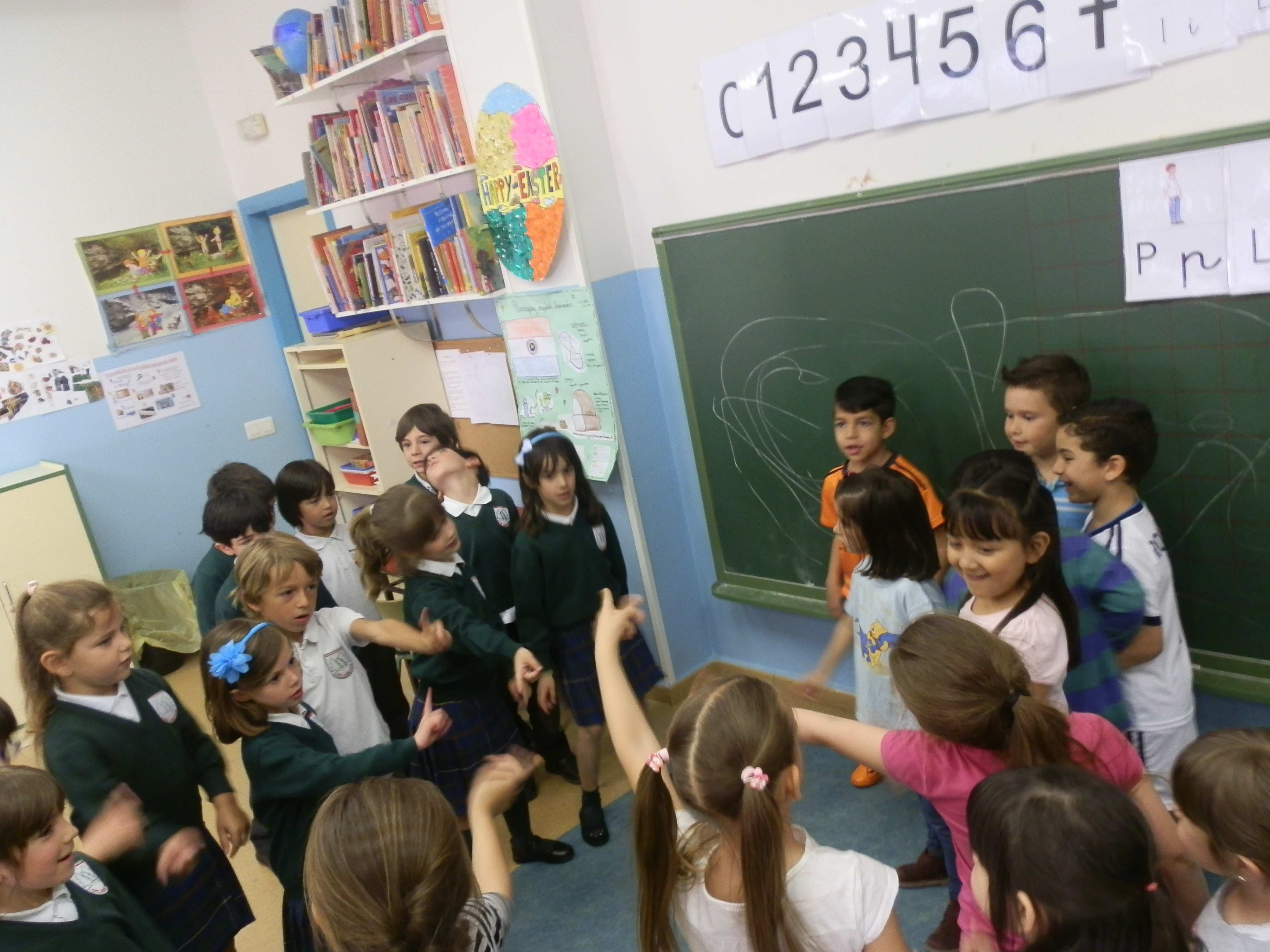 El viernes 9 de mayo vinieron a visitarnos los alumnos/as, de la clase de 5 años, del Colegio Los Abetos, qué está en Manzanares el Real (Madrid). Todos estábamos nerviosos esperando el momento. Por nuestra parte les habíamos preparado una canción de bienvenida y una exhibición de las canciones y bailes que ya sabemos y que más nos gustan. Ellos por su parte nos trajeron un cartel de su clase de inglés (se trata de un colegio bilingüe) y también nos hicieron su baile de fin de curso.