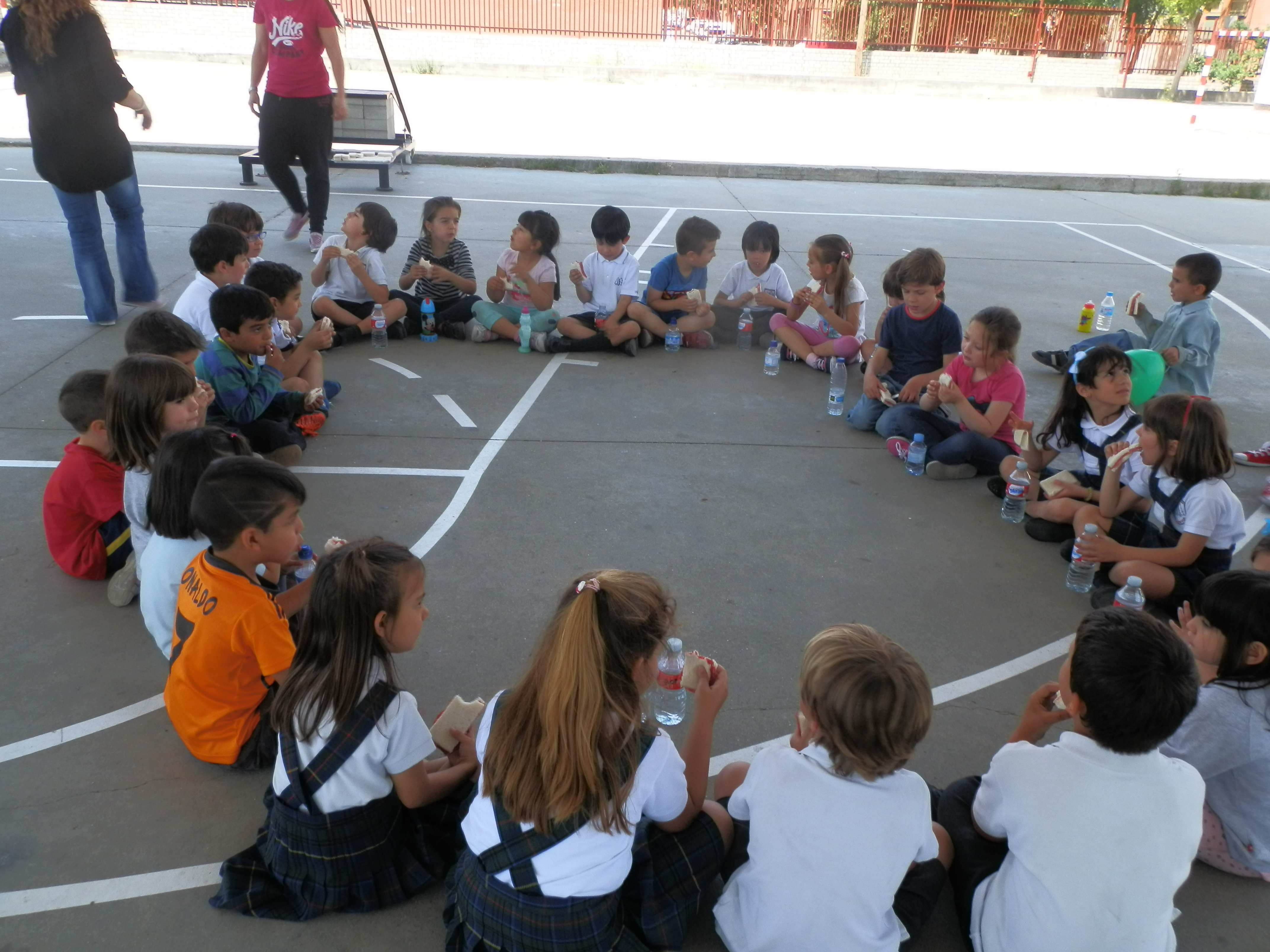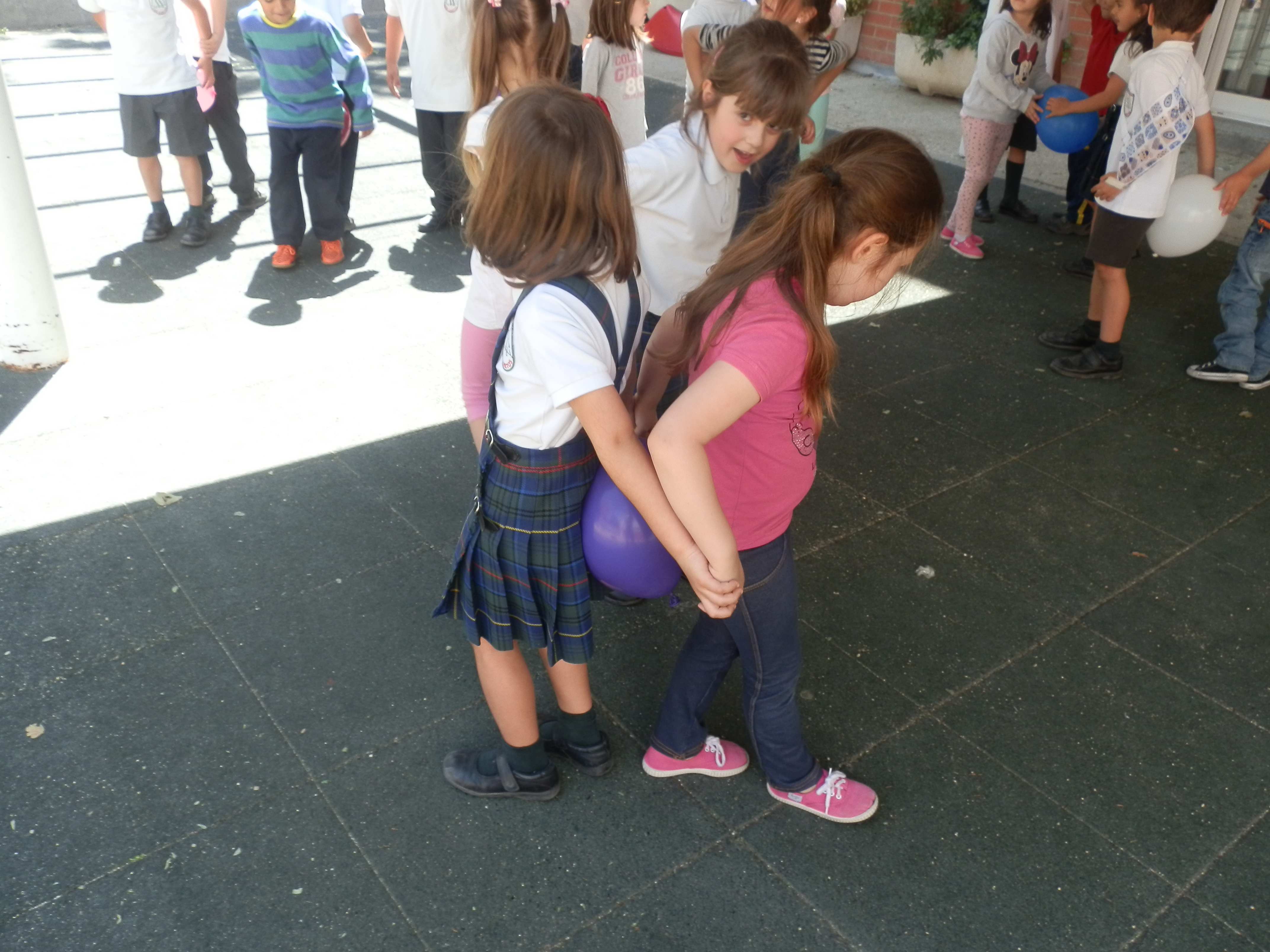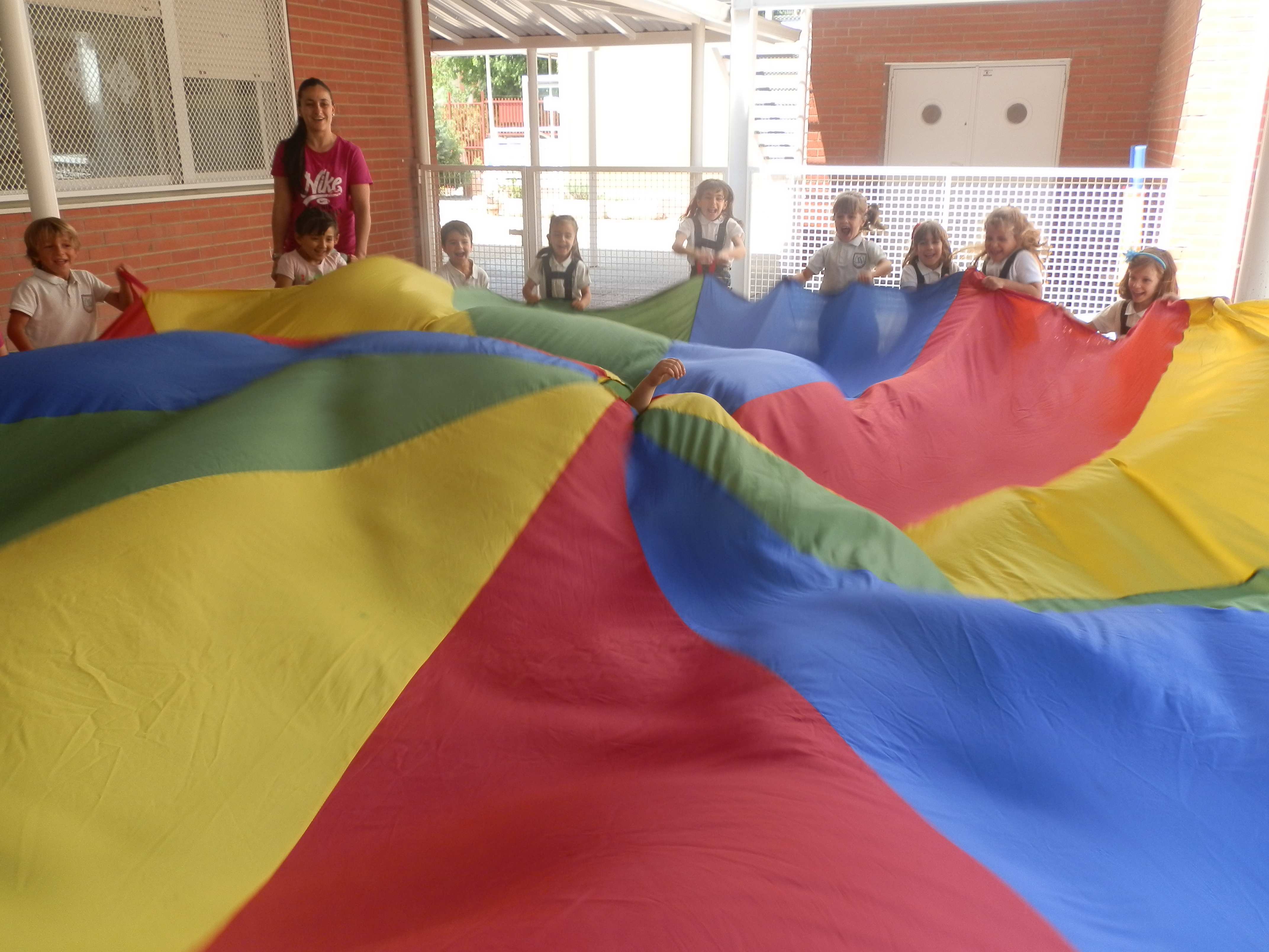 Nos intercambiamos un dibujo de un mandala que hicimos en la clase, jugamos en el patio con el paracaídas y globos y al final comimos en la pista todos juntos.