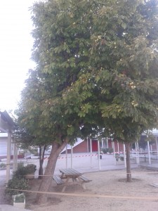 Era el curso 92/93, en el colegio habíamos hecho un curso sobre “Huerto y jardín escolar” que organizaba el Ayuntamiento y que estaba dotado con herramientas y una serie de árboles y plantas. Allí estaba nuestro Castaño de Indias, era finito y tenía unas cuantas yemas; con él venían unas cuantas Catalpas, un Phitosforo, herramientas… el colegio no era como ahora, tenía otros espacios, decidimos poner los árboles próximos a lo que era al colegio (sólo existía el actual para Primaria), y a nuestro Castaño le tocó en una esquina, un poco separado por si echaba muchas raíces. Muchos años de cuidados y riegos después se convirtió en el “árbol del patio”, era el más frondoso, su tronco era muy robusto y nos daba todos los años infinidad de castañas “locas” como se las suele llamar, con las que jugábamos los más pequeños ( y algunos grandes). Con el paso del tiempo, le plantamos al lado un compañero, que ahora se ha quedado solo, pero que sigue sus pasos en cuanto a robustez y frondosidad. Cuando veníamos al colegio en septiembre, ahí estaba esperándonos con sus castañas, dentro de esas bolas verdes con pinchos, tan curiosas. Este año cuando llegamos no estaba, que habría pasado, no quedaba nada de nuestro árbol…