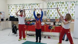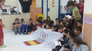 Nos explicaron las reglas de algunos deportes que se realizan en los juegos olímpicos y sacaron a vari@s niñ@s a practicar algunos deportes, como a Miguel (de 6º) y a Carlitos (de 5º) que levantaron pesas, o a Paula (de 5º) que hizo la cinta. Después saltamos 8 metros…bueno, lo intentamos.